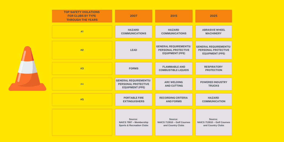 Hazard Communication, Recordkeeping, and Respiration Protection remain part of the top 10 OSHA violations at clubs.